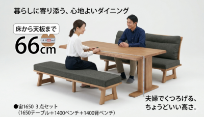 ■ソファのようなくつろぎを叶える「低めの」設計。ラバーウッドの温もりに包まれながら、家族が自然と集まりたくなるような、心地よい空間がつくれます。