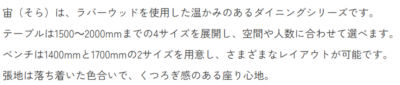 1500~2000㎜の4サイズテーブルと、ベンチ・チェアの多彩な組み合わせで、心地よく寄り添うダイニングです。